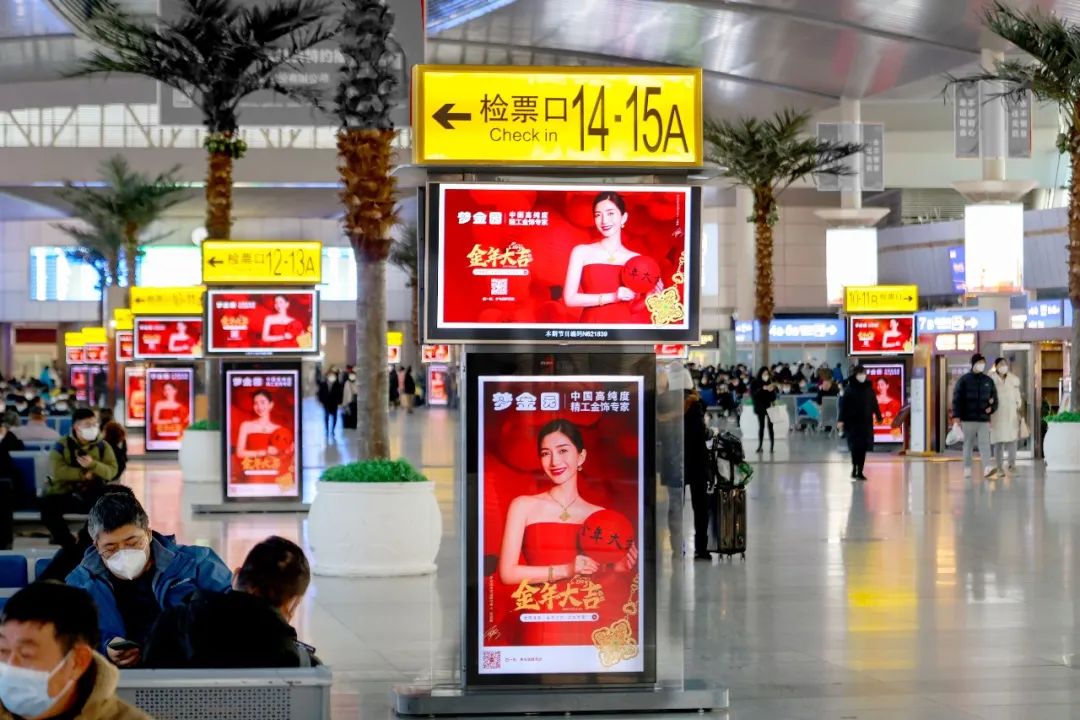 聚焦線下(xià),發力高(gāo)鐵(tiě)場(chǎng)景,兆訊傳媒助燃夢金(jīn)園引爆品牌戰略升級。依托中國(guó)高(gā¶o)鐵(tiě)權威名片為(wèi)品牌提供信任背書(shū),打造品牌傳播強陣地(dì),霸屏全國(guó)214座城(chéng)市(shì),登陸456個(gè)高(gāo)鐵(tiě)車(chē)站(zhàn),5499塊屏幕震撼發聲,形成旅客動線全覆蓋,以高(gāo)頻(pín)持續曝光(guāng)構建夢金(jīn)園品牌強力視(shì)覺符号。