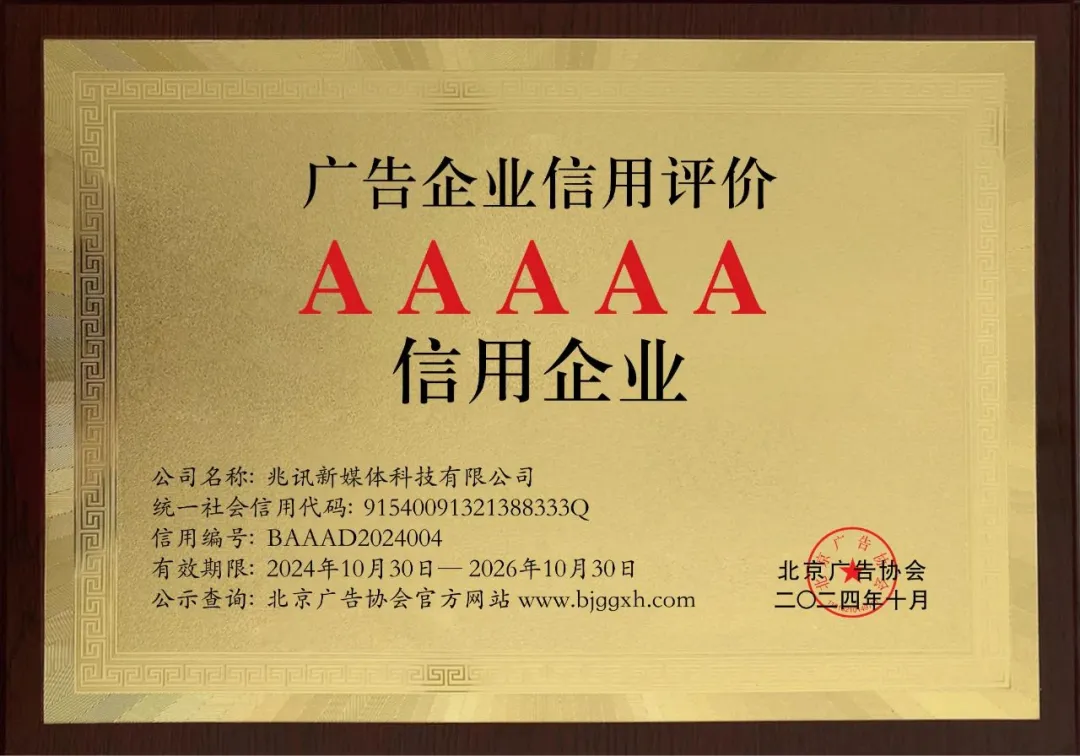 兆訊傳媒現(xiàn)為(wèi)北(běi)京廣告協會(huì)常務理(lǐ)事(shì)單位,連續多(duō)年(nián)獲得(de)“CNAAⅠ一(yī)級廣告企業(♠yè)”、“亞洲品牌500強”等專業(yè)認證及獎項,2024年(nián)10月(yuè)獲得(de)“北(bě≥i)京市(shì)廣告企業(yè)AAAAA級信用(yòng)企業(yè)”的(de)稱号,深獲業(yè)界好(hǎo)評。